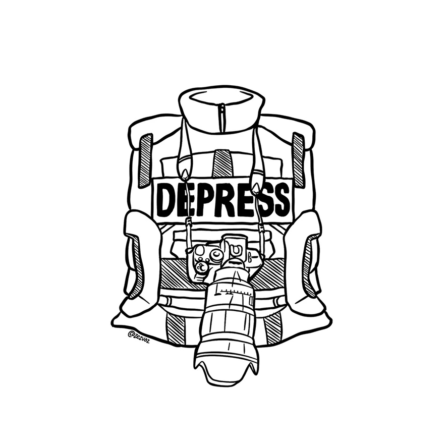 Καταθλίβω, καταπιέζω, ταπεινώνω, συντρίβω: Η μετάφραση του depress αποδίδει πλήρως το νόημα και υπηρετεί το αιχμηρό λογοπαίγνιο του σκίτσου. Η κατάσταση της δημοσιογραφίας δεν ήταν ποτέ χαμηλότερη – όχι λόγω έλλειψης δημοσιογράφων με αρχές, αλλά επειδή η ιδιοκτησία των μέσων ενημέρωσης εμποδίζει τη δημοσίευση μια καλής και ισορροπημένης δημοσιογραφίας σε ένα ευρύ αναγνωστικό κοινό. Ουδείς μπορεί να μάθει την αλήθεια, καθώς οι (περισσότεροι) μεγαλοεκδότες έχουν «δεμένους» τους (περισσότερους) δημοσιογράφους των ΜΜΕ. Αυτό καταγγέλλει χιουμοριστικά ο Πορτογάλος σκηνοθέτης, animator και σκιτσογράφος με το ψευδώνυμο Zez Vaz. Τα έργα του εμπνέονται ―και αναφέρονται― στη διεθνή γεωπολιτική, στην κωμωδία, στον αθεϊσμό, στην ποπ κουλτούρα, στην τεχνολογία και κυρίως στις συμπεριφορές των ανθρώπων. Ο ίδιος δίνει το στίγμα του με τα ακόλουθα λόγια: «Τα σκίτσα μου διαμορφώνονται από παγκόσμια γεγονότα, κοφτερή σάτιρα και ένα άγγιγμα μαύρου χιούμορ».