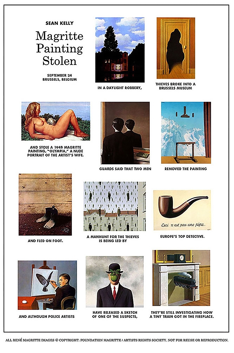 Αυτή η ασυνήθιστη ιστορία θα μπορούσε κάλλιστα να αποτελέσει το υλικό μιας αστυνομικής ταινίας (με χάπι εντ για να κόψει εισιτήρια). Έγινε, πάντως, το σενάριο ενός υβριδικού «ρεπορτάζ», από τον Αμερικανό Σον Κέλι. Διάσημος πολιτικός γελοιογράφος και σατιρικός συγγραφέας, συνεργάτης μεγάλων εφημερίδων όπως οι New York Times, Los Angeles Times, Washington Post κ.ά., ο Κέλι είναι γνωστός και για τα βραβευμένα έργα του στον τομέα της οπτικής δημοσιογραφίας. Την πρακτική αφήγησης ιστοριών για την επικοινωνία ειδήσεων και πληροφοριών, με τη χρήση εικόνων, γραφιστικών και άλλων στοιχείων, όπως το βίντεο, τα κινούμενα σχέδια και άλλες οπτικοποιήσεις δεδομένων. Ανταποκρινόμενος στην αυξανόμενη ζήτηση για αυτήν την πολυμεσική προσέγγιση στην ψηφιακή εποχή, ο Σον Κέλι απέδωσε το χρονικό της συγκεκριμένης κλοπής με χιούμορ σουρεαλιστικά εφάμιλλο του Μαγκρίτ. Η εξιστόρηση των γεγονότων, με ύφος που παραπέμπει σε αστυνομικό ρεπορτάζ, κατανέμεται σε 11 διάσημους πίνακες του ζωγράφου. Τα έργα συνδέονται με την αφήγηση, δημιουργώντας ένα πρωτότυπο κόμικς με την ακόλουθη σειρά: