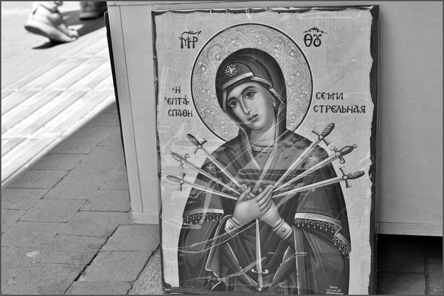 Στην καρδιά του εμπορικού κέντρου, στην άκρη ενός πεζοδρομίου, μια ιδιαίτερη εικόνα της Παναγίας περιμένει τον υποψήφιο αγοραστή. «Μ(ήτηρ) Θ(ε)ού» γράφει στην κορυφή. «Η Επτάσπαθη» προσδιορίζεται αριστερά, επαναλαμβάνοντας τον ίδιο χαρακτηρισμό με κυριλλική γραφή δεξιά. Πρόκειται για αντίγραφο μιας βυζαντινής εικόνας της Παναγίας της Επτάσπαθης, της «Πραΰνουσας ή Ἀπαλύνουσας τὰς κακὰς καρδίας», σύμφωνα με την πλήρη ονομασία της. Η Μητέρα του Θεού εικονίζεται με επτά σπαθιά: τα τρία ακουμπούν στον αριστερό ώμο, άλλα τρία στο δεξιό, ενώ το έβδομο, στραμμένο αντίστροφα, τρυπάει την καρδιά της από κάτω. Το μαγικοθρησκευτικό «7» της αρχαιότητας επανέρχεται στους χρόνους της Χριστιανοσύνης, σε ένα άλλο, εντελώς διαφορετικό πλαίσιο. Εδώ, η σημασία της κάθε μιας από τις επτά λόγχες είναι η κατανίκηση μιας εκδήλωσης του «πονηρού»: Το πρώτο σπαθί αφορά τις αρνητικές επιρροές και τους πειρασμούς. Το δεύτερο, τις ασθένειες και τις διάφορες ψυχικές και ψυχολογικές ταραχές. Το τρίτο, προβλήματα σε σχέση με το γάμο, τη γονιμότητα και τα παιδιά. Αλλάζοντας ώμο και σπαθιά έχουμε, αντιστοίχως: Το τέταρτο σπαθί, τις προσωπικές συμφορές (ατυχήματα, κίνδυνοι από ταξίδια κ.λπ.). Το πέμπτο, τη βασκανία, γλωσσοφαγιά, κακό μάτι και κατάρα, σε ενιαίο πακέτο. Το προτελευταίο σπαθί αφορά τις πλάνες, τις αδικίες και τις απάτες πάσης φύσεως. Όσο για το αντεστραμμένο έβδομο σπαθί, οι ερμηνείες διίστανται. Άλλοι, θεωρούν ότι αφορά τις εναπομένουσες εκδηλώσεις του «πονηρού»: Μίσος, οργή και θλίψη. Άλλοι πάλι πιστεύουν ότι συμβολίζει τις απέραντες θλίψεις και τον πόνο της καρδιάς που ένιωσε η Θεοτόκος στη διάρκεια της επίγειας ζωής της. Η κυριλλική γραφή στην εικόνα μαρτυρά την προέλευσή της: Η πρωτότυπη εικόνα βρίσκεται σε ένα χωριό, 5 χιλιόμετρα από την Μόσχα, και φυλάσσεται σε ένα εκκλησάκι αφιερωμένο στην Επτάσπαθη Παναγία. Μια παράδοση στη Ρωσία αναφέρει ότι η εικόνα προστατεύει το σπίτι από αρνητικές δαιμονικές ενέργειες, όπως τον φθόνο, και για αυτό συνήθως την τοποθετούν στην είσοδο. Είναι άγνωστο, εντούτοις, αν η αποτρεπτική δύναμη της Επτάσπαθης διατηρεί την ισχύ της στην άκρη του πεζοδρομίου, εξουδετερώνοντας τις όποιες δαιμονικές ενέργειες σε αυτό το σημείο.