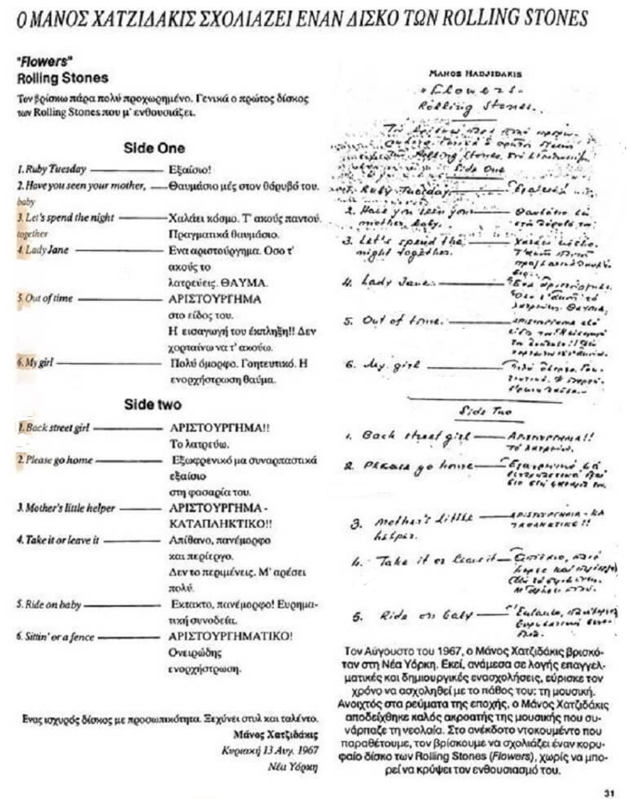 Ανοίγω εδώ μια παρένθεση για αυτόν τον ιδιοφυή μουσικό, μένοντας σε ένα εκπληκτικό άλμπουμ-ανθολογία του συγκροτήματος, με τίτλο Flowers (1967), που περιέχει συνθέσεις των «δύο» από το 1965.1 Ο Brian Jones, ως μουσικός, προσέθετε απίστευτα «χρώματα» στα τραγούδια, παίζοντας τα πιο απίθανα όργανα για rock & roll μπάντα: βιμπράφωνο («Out of Time», «Back Street Girl»), ντάλσιμερ των Απαλαχίων («Lady Jane»),2 άλτο φλογέρα («Ruby Tuesday»), το ιαπωνικό έγχορδο κότο («Take It or Leave It»), μαρίμπα («Under My Thumb», «Out of Time»), σιτάρ («Paint It Black»), τσέμπαλο («Ride On, Baby», «Sittin' on a Fence»), Mellotron («Please Go Home»), οτοάρπ – ένα έγχορδο όπως το σαντούρι («Ride On, Baby»).3 Υπήρχαν λοιπόν κι άλλοι τρόποι συμμετοχής στη δημιουργία. Πάντως, το συνθετικό δίδυμο συνέχιζε ακάθεκτο με τραγούδια-σταθμούς για τη ροκ μουσική («Midnight Rambler», «Gimme Shelter», «Honky Tonk Women»…). Κι αναμφισβήτητα λίγο πριν αποχωρήσει από το συγκρότημα ο Brian Jones (σε λίγο κι από τη ζωή), οι Stones είχαν «δέσει» εκπληκτικά και στις ζωντανές εμφανίσεις τους (εύκολα το διαπιστώνει κάποιος αν λ.χ. δει κι ακούσει το «Jumpin’ Jack Flash», από το «The Rolling Stones Rock and Roll Circus», Δεκέμβριο του 1968).4 Βέβαια, ο Απόλλων της ροκ, την κρίσιμη εκείνη εποχή, προνόησε κι αμέσως έπειτα, με τις μαγικές δυνατότητες τού Mick Taylor οι «Κυλιόμενες πέτρες» πέρασαν σε ακόμη βαθύτερους και πλατύτερους ορίζοντες (υπάρχουν κάποιες απίστευτες εκτελέσεις λ.χ. του «Gimme Shelter», και άφθονα άλλα επιτεύγματα τού τότε εικοσάχρονου κιθαρίστα),5 ο οποίος δεν άντεξε περισσότερο από πέντε χρόνια να τον τρέχουν ξέφρενα κι ασταμάτητα οι άλλοι τέσσερις του συγκροτήματος. Από τον Δεκέμβριο του 1974, μόλις έφυγε ο Taylor, με τον αντικαταστάτη του, τον Ronnie Wood, οι Stones δεν ήταν πια ίδιοι, κορυφαίοι («The worlds greatest rock & roll band», καθώς πίστευαν παντού), αλλά όχι όπως παλαιότερα… Μακρηγόρησα, ενώ ήθελα να κινηθώ σε άλλη κατεύθυνση. Ας μου συγχωρεθεί – you can’t always get what you want...